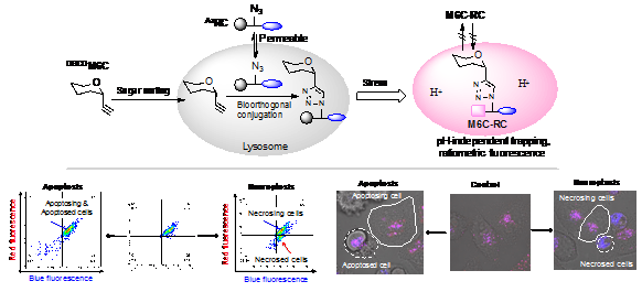 课题组利用该技术实现了胞吐、凋亡、坏死等不同信号传导过程溶酶体应激响应参数(pH,位置、尺寸等)的实时定量分析。该策略提供了一种通过有机反应研究复杂生物过程的新方法与新思路,并有望拓展到其它种类细胞器应激反应的研究。