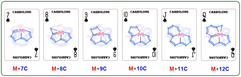 2013年,夏海平课题组首次报道了7碳链螯合金属的全新芳香骨架基元-金属杂戊搭炔(Nature Chem., 2013, 5, 698)。随后,拓展构筑了一系列8-12碳链螯合金属的全新芳香分子骨架,并被同行们称之为“碳龙同花顺”,建立了具有中国特色的“碳龙化学 (Carbolong Chemistry) ”。