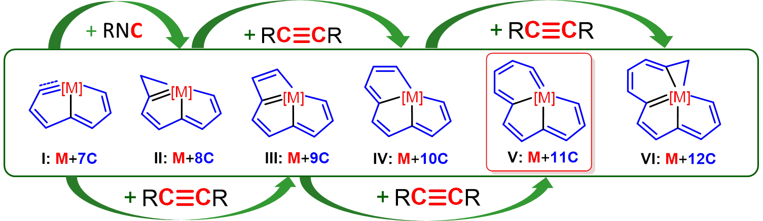 近年,我院系列报道了一类全新的芳香体系——金属杂戊搭炔I (Nature Chem., 2013, 5, 698; ACIE, 2015, 54, 7189)和金属杂戊搭烯I (Nature Commun., 2014, 5, 3265)。该分子骨架可看成是由7个碳原子组成的纯碳链(Carbolong)与过渡金属的螯合物。随着碳链的增长,一系列金属桥位多环分子骨架被报道,包括:8碳龙骨架II (ACIE, 2015, 54, 3102)、9碳龙骨架III (ACIE, 2015, 54, 6181)、10碳龙骨架IV (ACIE, 2017, 56, 9067)、12碳龙骨架VI (Sci. Adv., 2016, 2, e1601031)等。因此,逐步建立了独特的“碳龙化学”(the chemistry of Carbolong)。然而,碳龙家族的最后一个成员,由11个纯碳原子与过渡金属螯合的分子骨架V却一直未正式报道。