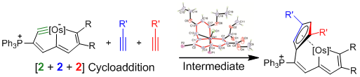 早期研究表明,9碳龙化合物III可通过7碳龙化合物I与一分子炔烃反应得到。在此基础上,再增加一分子炔烃,是否可以得到11碳龙化合物V。实验证明,通过7碳龙化合物金属杂戊搭炔与两分子炔烃的[2+2+2]环加成反应,成功的分离得到11碳龙化合物。这也是首次实现后过渡系金属卡拜化合物与炔烃的[2+2+2]环加成反应,为后过渡系金属卡拜化合物催化炔烃聚合提供了新的认识。至此,碳龙化合物家族已形成一个完整的同花顺序列。