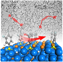 在分子水平上认识纳米材料表界面化学反应微观机理是实现其催化性能精准调控的重要基础,更是提高催化剂选择性并将其应用于绿色化工生产技术的关键。氢化反应是化工行业的重要支撑,选择性氢化广泛应用于精细化学品、医药和农用化学品合成。工业上一般采用添加剂(如醋酸铅等有毒物质)来修饰毒化金属催化剂,从而实现高选择性。但由于添加剂的多样性和复杂性,催化剂表界面构-效关系微观图像仍然不明确,使得催化氢化技术的发展仍然停留于传统的试错阶段,远未达到理性设计的阶段。一个典型例子是已在工业上应用40多年的林德拉(Lindlar)催化剂,该催化剂被广泛应用于炔基的半氢化选择性加氢,但表面毒化实现高催化选择性所付出的代价是其上贵金属(通常为5%)仅有0.02% 具有催化活性,大部分贵金属未能得以利用。