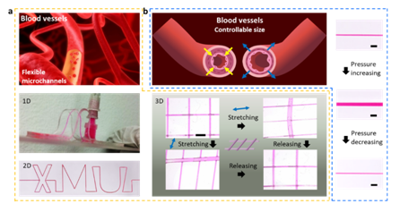 柔性微流控系统由于其可伸展/弯曲,通过与人体皮肤表面直接接触,可用于便携式可穿戴电子设备,为生命体征提供重要的参数。然而,由于柔性微流控系统复杂的制备工艺和基底材料的限制等巨大的技术挑战,是制约其应用的重要问题。同时,制备动态的且孔径可控的微流控系统仍然具有挑战。受到柔性血管的启发,侯旭教授课题组在弹性体高分子膜基材料微流控技术方面取得进展,其研究成果“Bioinspired Universal Flexible Elastomer-Based Microchannels”在Small(2018, DOI:10.1002/smll.201702170)发表。