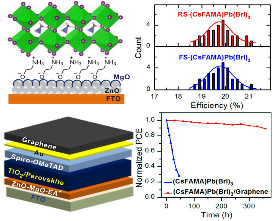 该项研究通过在ZnO表面配位化学修饰一薄层MgO桥连的质子化乙醇铵,实现了高效、无迟滞以及稳定钙钛矿电池的加工。系统的研究工作发现,相关界面配位化学调控取到如下重要作用:1) 在ZnO表面上修饰薄层MgO,使乙醇胺的配位方式由非解离中性配位向解离单齿配位转变,质子化的乙醇铵促进光生电子从钙钛矿层向ZnO层的有效提取和传输,提高了该太阳能电池的短路电流,并完全消除了其迟滞现象; 2) 质子化的乙醇铵使钙钛矿中的质子化甲基铵阳离子不容易迁移到ZnO电子传输层的表面,起到了表面钝化作用,提高了钙钛矿-ZnO电子传输层界面的化学稳定性,从而提升了电池的整体稳定性;3) MgO和乙醇胺的共修饰提高了能级匹配程度,有效地促进了界面电荷传输,从而提高了该太阳能电池的开路电压、填充因子和光电转换效率。基于相关发现,他们成功地实现了最高效率达21.1%且无迟滞的钙钛矿太阳能电池,并进一步利用疏水导热二维石墨烯材料对电池进行封装,相应的电池器件可以在70%的湿度下稳定工作超过300小时。