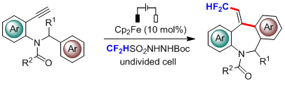 有机氟化物在制药、农业、材料科学等领域发挥越来越重要的作用。其中二氟甲基可作为氢键供体,已被用作药物设计中酰胺、醇、硫醇和异羟肟酸的亲脂电子等排体。然而引入二氟甲基的方法还较少,也缺少稳定、易得的二氟甲基化试剂。徐海超课题组以商业化的二氟甲磺酰氯和叔丁氧羰基肼为原料,经一步反应得到新的二氟甲基试剂CF2HSO2NHNHBoc。该固体试剂稳定且易于处理,并经二茂铁催化电氧化转化为活泼二氟甲基自由基,该自由基对炔烃底物加成、环化形成dibenzazepine类结构,这类结构是多个药物分子的核心骨架。另外,利用该试剂也实现了烯烃、烯炔的高效二氟甲基化反应,迅速构建多种含有二氟甲基的氮杂环。研究方法延续了课题组一贯追求的绿色、安全的有机合成方法学的理念,仅用廉价、易得的二茂铁为催化剂,避免其它传统贵金属催化剂和氧化剂的使用。