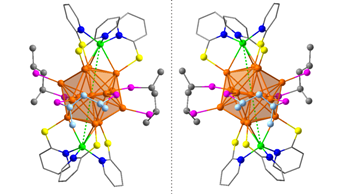 手性普遍存在于微观和宏观世界之中。纳米团簇作为连接小分子和纳米颗粒的桥梁,为解析手性纳米颗粒手性来源提供了很好的模型。近两年,郑南峰教授课题组发展了系列对映选择性合成手性金属纳米团簇的方法(J. Am. Chem. Soc. 2016, 138, 12751;J. Am. Chem. Soc. 2017, 139, 16113)。在该项研究中,他们发现使用双二苯基膦丙烷与巯基吡啶混配体可制备出内核为非手性的,手性仅由配体的不对称排列引起的手性金属团簇,该团簇以外消旋体的形式存在,难以分离。但他们通过单晶结构分析发现外消旋的Au13Cu2团簇的两种手性构型与其使用的双二苯基膦丙烷中C-C-C链的取向有直接关系,在合成中直接引入了手性双膦,使得双膦配体中C-C-C链的取向可以通过手性季碳的绝对构型得以固定,得到100% 光学纯R或S构型Au13Cu2团簇。此外,他们还结合结构分析和理论计算发现了该团簇的手性主要源于巯基吡啶(非手性配体)的不对称排列,而手性双膦配体的作用主要是提供空间位阻以稳定巯基吡啶的不对称排列,并不直接贡献于团簇的手性光谱信号。该研究为制备内核为非手性的手性金属纳米颗粒提供了一种有效的合成策略,并为解释手性纳米材料的手性来源提供了很好的模型。