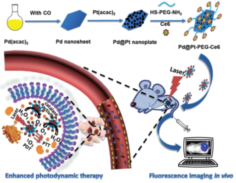 缺氧微环境是实体肿瘤的重要特征,在肿瘤血管生成和癌症转移中起到重要作用。缺氧过程中容易产生一些不良的肿瘤代谢物(如过氧化氢等),这些代谢物会促进癌细胞的诱变和转移。同时,缺氧微环境还会引起肿瘤对光动力学治疗、放疗等治疗的抵抗,导致治疗失败。为了改善肿瘤乏氧微环境并提高光动力学治疗效率,课题组以前期发现的Pd@Pt纳米材料所具有的过氧化氢酶活性为基础,制备了一种兼具调节肿瘤乏氧微环境能力和增强光动力学治疗效果的纳米治疗试剂Pd@Pt-PEG-Ce6。利用Pd@Pt纳米片的过氧化氢酶活性即分解过氧化氢产生氧的能力改善了肿瘤的乏氧微环境,同时Pd@Pt纳米片负载光敏剂二氢卟酚(Ce6)可高效地将其递送到肿瘤部位,增强光动力学肿瘤治疗的特异性。这一新型纳米诊疗体系的设计不仅拓宽了纳米材料酶活性在生物活体内的应用,同时有望大幅改善实体肿瘤乏氧环境下的治疗效果,为新型纳米诊疗体系的设计提供了新的思路。