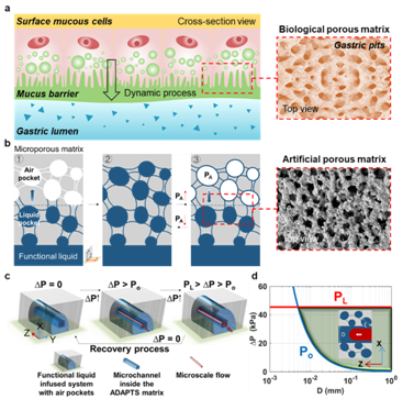 动物胃粘膜的屏蔽效应为研究人员提供了新的灵感,动物胃粘膜屏障中的粘液细胞会分泌粘液保护其免受胃酸的侵蚀。受此启发,研究人员设计合成了具有动态复合液体的多孔高分子膜材料,并在其中构建微米通道,功能液体可以在微孔和微通道中动态流动。突破传统固/液材料界面设计的限制,应用全新的动态固/液/液界面设计制备液体复合高分子膜材料带来优异的抗污染性能,对无机物,有机物以及复合物甚至血液都具有很好的抗污作用。此外,由于微孔与微通道在一个尺度数量级,这样一来,复合功能液体在微孔和微通道中的临界压强阈值就在可以协同调控的范围内,从而获得特有的双门控调控微流体输运行为,为微流体输运控制在药物释放,微反应器,柔性机器人,生物/环境检测技术等发展带来了全新的思路和广阔的应用前景。