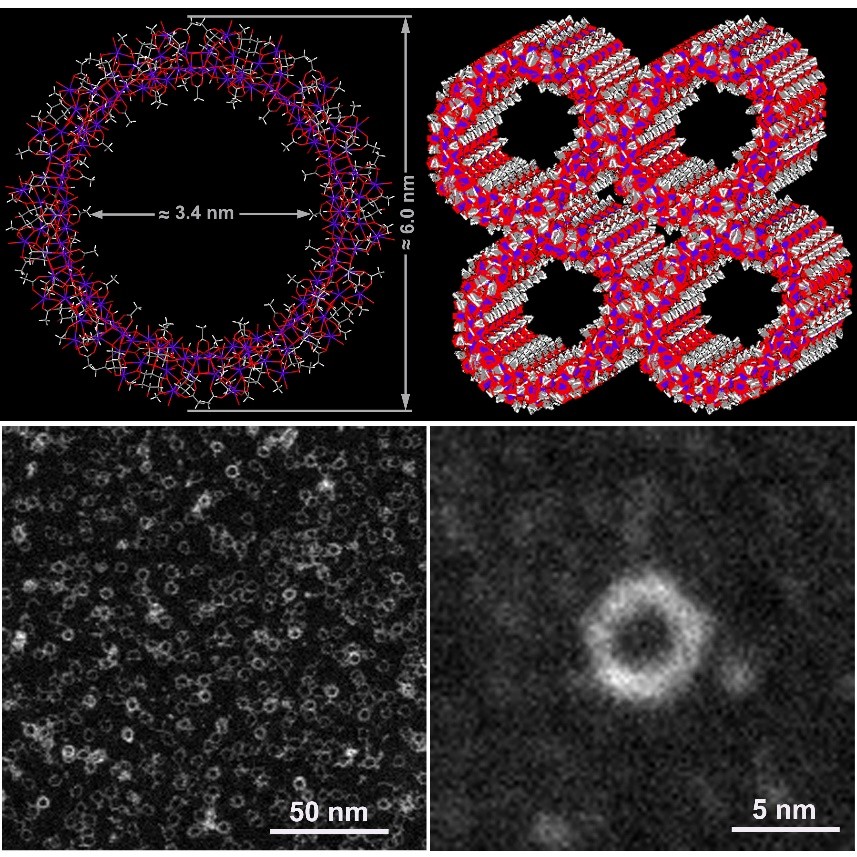 该课题组近年来在稀土团簇化学领域开展了深入的研究,提出了阴离子缓释及模块单元的组装策略合成高核稀土团簇化合物(Coord. Chem. Rev. 2017, https://doi.org/10.1016/j.ccr.2017.10.023),发展了一种制备单分散金属团簇的简单普适方法(Angew. Chem. Int. Ed. 2016, 55, 4532),研究了稀土-过渡金属团簇的单分子磁性 (Angew. Chem. Int. Ed. 2017, 56, 11475)。基于前期的研究基础,该课题组利用阴离子缓释的方法制备了包含140个稀土离子的高核稀土团簇Gd140,这是目前报道的最高核数稀土团簇。晶体结构分析发现,该分子是由十个{Gd14} 结构单元相互连接形成巨大的环状结构,表现出十重结构对称性的特征。大环的外径为6.0nm, 内径为3.4nm, 厚度为1.5nm,是目前为止报道的环状团簇中拥有的最大内外径尺寸。同时,该环状稀土团簇相互堆积沿a轴向可以形成规则的一维纳米孔道。 高分辨透射电镜结果表明此大环状结构在乙醇溶液中保持了足够的结构稳定性,这也是第一次在电镜下观测到稀土团簇的存在。另外,该课题组还对该复杂体系的磁性进行了实验与理论计算研究。