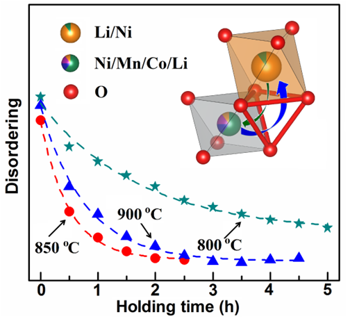 发展能量密度高达300Wh/kg的电池体系是国际上非常关注的新一代锂离子电池, 而高镍正极材料是其中必不可少的正极材料体系.但是由于高镍正极材料(尤其是当镍含量高于0.7时)合成较为困难,其容量发挥和循环稳定均容易表现不佳. 该研究工作通过多种谱学表征技术,如原位x-射线衍射,x-射线吸收谱,中子衍射谱和高分辨固体核磁谱证实控制合适的合成温度(~850oC)和反应时间, 可以得到结晶性好,离子混排度低的LiNi0.7Co0.15Mn0.15O2 的正极材料, 在3.0-4.3V电位区间,10mA/g电流密度条件下, 其可逆放电容量可达197mAh/g, 50周的循环容量保持率可高达93.5%. 在3.0-4.5V的电位区间,可逆放电容量高达240mAh/g. 该论文同时还通过合适的热力学与动力学分析, 详细讨论了各种制备条件对高镍材料晶粒生长与阳离子混排过程的影响(见附图).