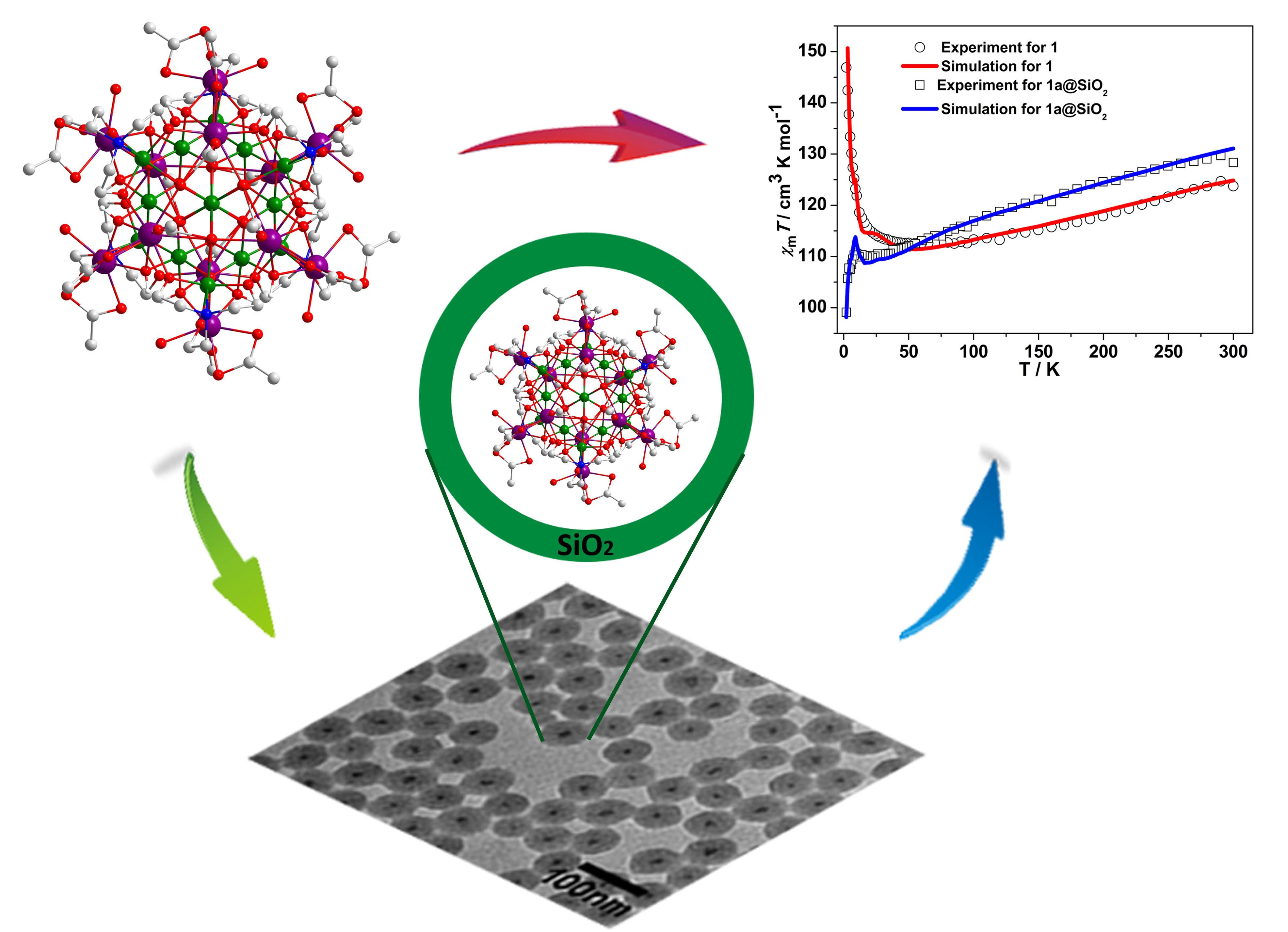 理解复杂团簇体系中的磁交换作用对指导团簇磁性材料的设计与合成至关重要,而目前单分散团簇的磁交换作用的实验与理论研究非常少。该课题组制备了目前报道的最高核稀土-铁氧团簇Gd12Fe14,并利用反相微乳法成功制备了单分散团簇Gd12Fe14@SiO2的核壳结构。实验与理论研究表明,SiO2层的包覆不但有效消除了团簇间的磁相互作用,而且增加了外围Fe3+离子的磁零场分裂值,同时降低了整个团簇分子的磁各项异性。该研究为人们理解单分散金属团簇分子的磁交换作用提供了新的认识。