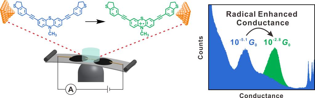 单分子尺度的电输运研究能够为有机电子材料和器件的设计提供实验支持,而自由基则是近年来该领域的研究热点。如何构筑稳定且具有独特电输运性质的自由基电子器件,是该领域现阶段的核心挑战之一。这一研究工作发现了吩噻嗪phenothiazine衍生物分子结在室温下可通过原位反应形成能够长时间稳定存在的自由基,且该自由基的形成使单分子电导提升了超过200倍。结合理论计算,研究者指出,自由基的形成极大地缩小了分子器件的HOMO-LUMO能带隙,从而显著增强了自由基单分子结的电输运能力。这一研究工作表明了自由基在有机电子器件和电学材料中具有重要的潜在应用价值。