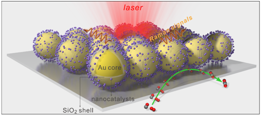 原位监测纳米催化反应过程对深入认识反应机理、设计高效催化剂具有重要意义。作为一种具有超高灵敏度的表面分析技术,表面增强拉曼光谱(SERS)是可提供反应过程中催化剂表面吸附物种的丰富信息。然而,仅有Au、Ag、Cu等少数金属在形成特定纳米结构时才能提供较强的拉曼增强,且它们会对催化剂的性质及反应过程产生严重干扰。这就极大地限制了SERS在实际多相催化体系中的应用。鉴于此,该论文发展了一种利用壳层隔绝纳米粒子增强拉曼光谱原位监测纳米催化过程的方法(SHINERS卫星策略)。通过将纳米催化剂组装于壳层隔绝纳米粒子(SHINs)表面,形成SHIENRS卫星结构,利用内核Au纳米粒子增强催化剂表面的拉曼信号,SiO2壳层隔绝Au对催化剂及反应的影响,从而直接获得了纳米催化剂表面物种的真实信息。利用这种SHINERS卫星策略,他们实现了CO氧化反应的原位监测,直接观测到了反应条件下催化剂表面吸附物种(例如表面氧化物、氧物种、Pt-C及Pd-C等,并结合DFT计算,对反应机理进行了阐述。该研究表明SHINERS卫星策略可作为原位跟踪催化反应过程的有效方法,为纳米催化的原位研究提供了一种新的思路。