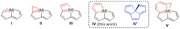 近年,我院系列报道了一类全新的芳香体系——金属杂戊搭炔(Nature Chem., 2013, 5, 698; ACIE, 2015, 54, 7189)和金属杂戊搭烯(Nature Commun., 2014, 5, 3265)。在此基础上,一系列金属桥位多环分子骨架被报道,包括:金属杂戊搭烯并三元环II (ACIE, 2015, 54, 3102)、金属杂戊搭烯并四元环III (ACIE, 2015, 54, 6181)、金属杂戊搭烯并六元环V (Sci. Adv. 2016, 2, e1601031)等。这是一类全新分子骨架基元,可分别看成由7、8、9、12个碳原子组成的纯碳链(Carbolong)与过渡金属的螯合物。因此,我校逐步建立了独特的“碳龙化学”(the chemistry of Carbolong)。然而,碳龙家族的重要成员,由10个纯碳原子与过渡金属螯合的三并五元环骨架IV却一直未见报道。