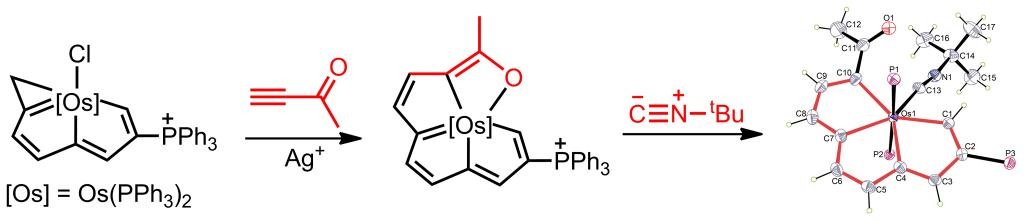 在经典有机化学中,因为中心碳原子的sp3杂化,由全碳原子组成的三并五元环骨架IV’是非平面的,至今仍未见报道。本文报道引入过渡金属替代有机三并五元环骨架IV’的中心sp3杂化碳原子,首次合成得到金属处于桥头位的三并五元环分子骨架。由10个碳原子组成的纯碳链与过渡金属螯合的分子骨架IV是碳龙化学的重要一环。