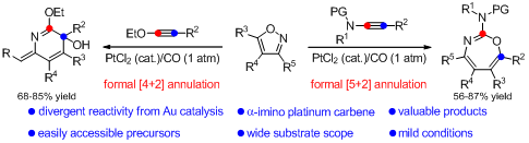 α-亚胺金属卡宾活性中间体是有机合成中非常重要的一类反应中间体,可用于构建一系列复杂含氮分子,特别是合成上非常有用的含氮杂环化合物。2015年,叶龙武课题组首次报道简单易得的异噁唑可作为氮源,在Au催化下与炔酰胺反应用于高效构建2-氨基吡咯这一重要杂环骨架,从而实现了Au催化的形式上[3+2]环化反应。这是首例以原子经济性的炔烃胺化反应来产生α-亚胺金卡宾,相关工作发表在Chem. Sci. (2015, 6, 1265),受到国内外广泛关注。例如,德国海德堡大学的Hashmi教授利用这一策略,将异噁唑拓展至苯并异噁唑,报道了类似的形式上[3+2]环化反应 (Angew. Chem. Int. Ed. 2016, 55, 794) 及[4+2]环化反应 (Angew. Chem. Int. Ed. 2016, 55, 12688)。课题组进一步研究发现若使用Pt作为催化剂,产生的α-亚胺铂卡宾则会被异噁唑的氧端通过1,7环化捕获,这也是首例报道的α-亚胺铂卡宾。当异噁唑与炔酰胺反应时,反应会通过形式上[5+2]环化途径得到合成上非常有用的1,3-氧杂含氮七元环。而当异噁唑与炔醚反应时,反应则会通过形式上[4+2]环化途径得到相应的2,5-二氢吡啶化合物。吕鑫课题组通过密度泛函理论(DFT)计算,很好地诠释了该类反应的机理,特别是明晰了反应化学选择性控制的根源。