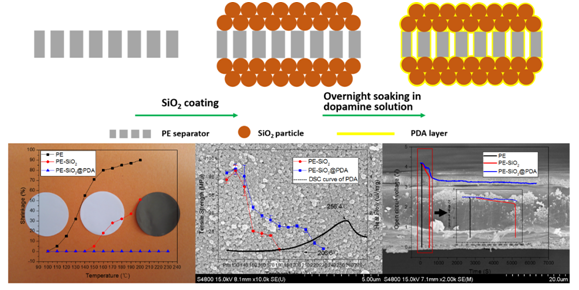 该研究在课题组先前研究的基础上,利用仿生材料——聚多巴胺对陶瓷涂覆隔膜进行进一步的功能化修饰,设计开发出的一种具备高安全特性的隔膜材料。利用多巴胺的自氧化聚合反应,将陶瓷涂覆隔膜在多巴胺溶液中过夜浸泡之后,聚多巴胺在陶瓷涂层和聚烯烃基膜形成连续完整的成膜包覆层,使得陶瓷层和基膜成为一个整体。由于聚多巴胺本身具有良好的耐热性能,耦合聚多巴胺和陶瓷粉体的功能之后,复合功能隔膜展示出优异的热稳定性,其不仅在超过200℃的温度下不会有任何收缩,而且在230℃之前都可以保持良好的机械性能,这对于保障电池安全具有非常重要的意义。OCV测试结果也显示,复合功能隔膜可以保证电池在高温下的安全。该种设计的隔膜,在需要高安全特性的动力锂离子电池中具备良好的应用前景。
