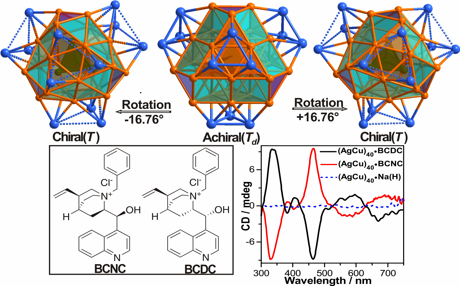 手性是自然界的基本特征之一,普遍存在于微观和宏观世界之中。手性化学的发展建立了系列合成手性分子的有效方法,并因此推动了手性化合物的广泛应用。近年,手性纳米材料的研究也越来越受到大家的关注,它们的重要应用潜力不断被挖掘出来。但当前人们对这类介于分子与宏观尺度之间的手性纳米材料的手性来源的理解较为有限,也尚未建立行之有效的宏量化学合成方法。该工作报道了全新手性双金属纳米团簇[Ag28Cu12(SR)24]4−的合成及其全结构。 单晶结构分析表明,[Ag28Cu12(SR)24]4−团簇是由一个扭曲的Ag4@Ag24金属内核和四个近平面的[Cu3(SR)6]单元组成。Ag4@Ag24可视为面心立方Ag的部分,由四个Ag10四面体通过共用一个小的Ag4四面体形成,理应具Td对称。但由于四面体的扭曲,Ag4@Ag24金属内核和整个Ag28Cu12金属框架的点群由Td变成T, 导致手性纳米团簇的形成。以非手性季铵盐为抗衡阳离子,合成得到是左、右扭曲团簇各占一半的一对对映体。DFT理论计算表明团簇的手性主要源于其扭曲的Ag28金属内核,为手性纳米颗粒的手性来源提供了新认识。更为重要的是,质谱研究发现溶液中的[Ag28Cu12(SR)24]4−团簇与季铵盐间存在强的离子对作用力,引入手性季铵盐代替非手性阳离子,即可利用手性离子对作用选择地保护其中的一种异构体,成功地实现手性团簇的拆分和直接不对称合成。该研究为合成手性金属纳米颗粒提供了一种有效的合成策略。