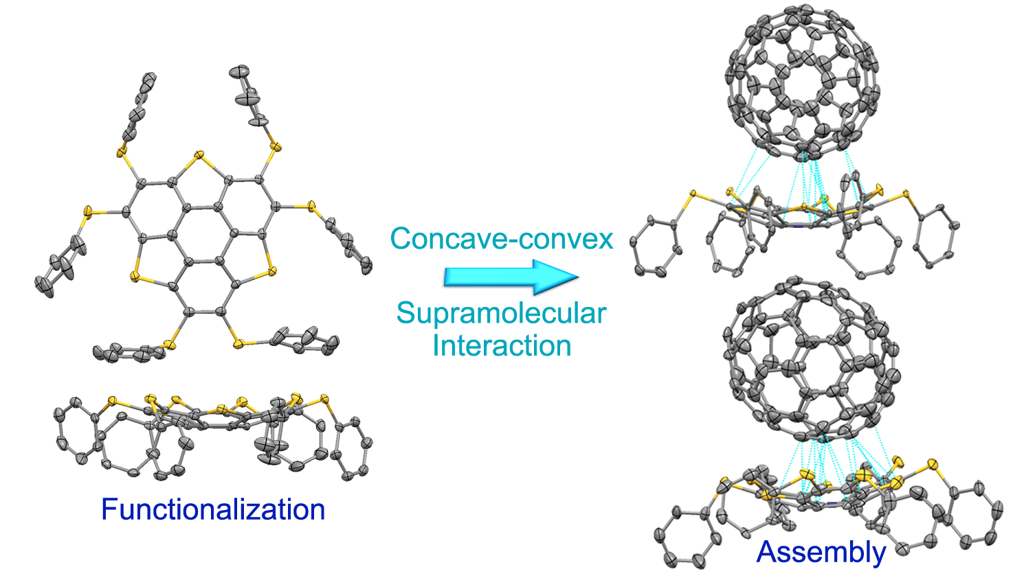 巴基碗因其独特的碗状结构表现出优异的超分子组装特性。通过功能化修饰及杂原子掺杂,可以增强巴基碗的超分子识别及组装。课题组成功地以溴化硫杂巴基碗为中间体合成了一系列的硫醇化硫杂巴基碗。得益于硫醇化硫杂巴基碗的碗状结构及强电子给体能力,硫醇化硫杂巴基碗可以与富勒烯形成凹-凸型给受体超分子组装体,并其通过单晶衍射分析揭示了该超分子组装体的精确结构。结合核磁滴定,研究了硫杂巴基碗与富勒烯在液相的超分子组装行为。硫杂巴基碗/富勒烯超分子组装体表现出良好的热稳定性及光电导性。该工作为今后杂原子掺杂的巴基碗的功能化及超分子组装提供了新的研究思路。