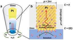 例如,硫酸介质中铂电极表面水的解离吸附是电化学的经典课题。在宏观尺度的铂电极上,氢、氧吸附物种在铂表面的吸脱附电流与循环伏安法的扫描速率成正比。然而,詹东平教授课题组的研究表明,在纳米铂电极上,氢、氧吸附物种在铂表面的吸脱附电流不再与循环伏安法的扫描速率成正比,而是与扫描速率的平方根成正比,表现出显著的扩散特征。如图1所示,由于吸附物种浓度的差异,在电极/溶液界面毗邻的铂表面上会存在一个扩散区。由于吸附物种的扩散程很短,在宏尺度电极上由扩散引起的电量几乎可以忽略不计;然而在纳米电极上,吸附物种的表面扩散就会成为主导因素。根据吸附电量和扫描速率平方根的倒数关系就可以得到铂表面氧吸附物种的扩散系数((5.61 ± 0.84) × 10−10 cm2/sat 25 °C):