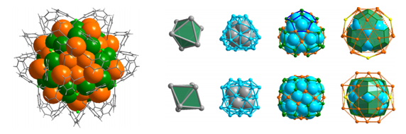 高核金属纳米团簇是低核金属配合物到纳米颗粒的重要过渡物种,其合成和表征极具挑战性。目前国际上对硫醇、膦配体和炔配体保护的金属纳米团簇进行了广泛的研究,外围配体对的团簇结构多样性和性能可控性的影响显著。课题组发现卤素作为配体对金属纳米团簇的形成起着重要的作用,并且获得了确定结构的含有110核的金属纳米团簇[Au80Ag30(C≡CPh)42Cl9]Cl。该团簇的110个金属以类似“俄罗斯套娃”的形式分为四层排布: Au6@Ag35@Ag30Au18@Au21。该结构是目前已报道的最大核数的异金属金银纳米团簇。实验结果表明:卤素对促进高核团簇结构的形成及稳定性起着重要作用,为今后研究氯化物在金属纳米团簇中的影响提供重要思路。
