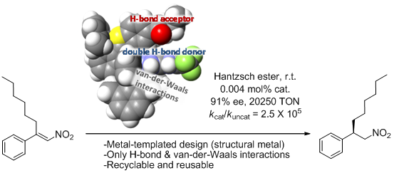 本工作以手性金属配合物为模板,通过精密的分子设计和结构修饰,发展出一类仅依赖氢键和范德华力等弱分子间作用即能实现超高效率催化的催化剂。在模型转移氢化反应中,催化剂的用量可降低至十万分之四而保持高立体选择性,并且经多次回收再利用不失活。文中通过核磁共振、与底物共结晶、动力学实验等详细探讨了催化反应机理,并结合理论计算证明了金属模板在设计高效催化剂中的有效性和优势,为新型手性催化剂的开发提供更多的思路。