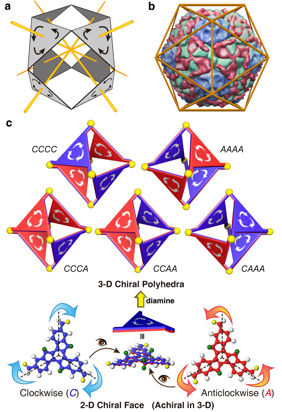 自然界中正二十面体病毒衣壳的面上蛋白质亚基具有朝同一方向“旋转”的特性,数学家也将面方向性引入多面体中以增加其复杂度。化学家们通过分子组装制备了种类众多的分子多面体,这些分子多面体大致分为两类,一类构筑分子基元为棱,其多面体面为空,另一类是由高对称性的平面分子构筑基元组装而成,而具有面方向性的分子多面体尚未见报道。