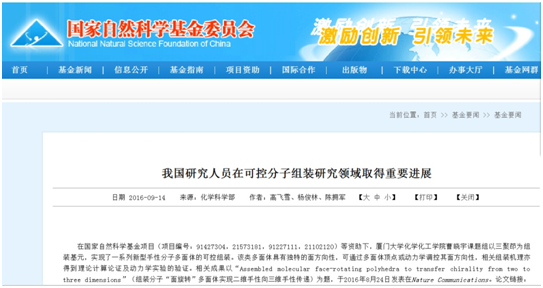 曹晓宇课题组在可控分子组装领域取得重要进展,相关成果以”Assembled molecular face-rotating polyhedra to transfer chirality from two to three dimensions”为题发表在《自然-通讯》(Nature Communications, DOI: 10.1038/NCOMMS12469),国家自然科学基金委“基金要闻”9月14日报道了这一成果。