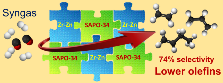 低碳烯烃,包括乙烯、丙烯和丁烯,是重要的基干化工原料,由合成气直接制低碳烯烃对于发展煤、页岩气和生物质等替代石油的路线具有重大意义。传统的费托合成过程主要围绕铁催化剂,但产物选择性受限于ASF分布(58%),这也阻碍合成气直接制低碳烯烃走向应用。最近中科院大连化物所包信和院士团队通过发展新OX-ZEO过程显著提高低碳烯烃选择性,在合成气直接制低碳烯烃领域取得重大突破(Science 2016, 351, 1065-1068)。王野教授课题组在前期研究基础上,进一步拓展反应耦合的研究思想,将甲醇合成反应与C-C偶联(甲醇制烯烃)反应耦合,成功设计出Zr-Zn/SAPO-34双功能催化剂,在低碳烯烃选择性方面取得突破。在较温和条件下(1 MPa/400oC/H2:CO = 2:1),低碳烯烃选择性达74%,CO转化率为11%。