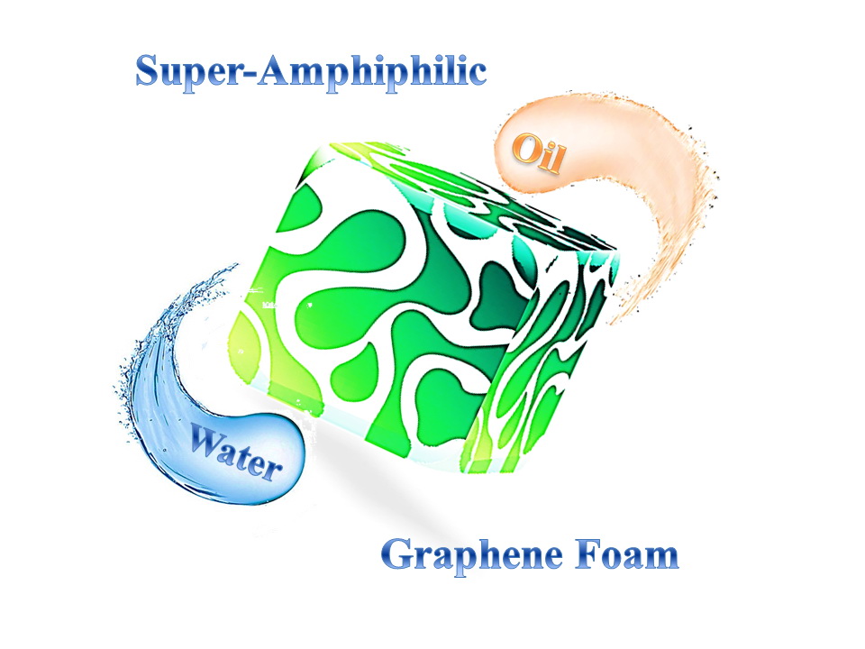 课题组受到自然多种多样的生物质的启发,选取多羟基的植酸作为凝胶剂,掺杂剂和表面修饰剂,与氧化石墨烯反应,通过水热合成的简单法得到一种新型的超亲水同时超亲油的三维石墨烯泡沫(PAGF),这也是首次合成出具有超双亲性能的三维石墨烯材料。所得超双亲PAGF内部疏松多孔,并且对水、油具有零接触角,具备对水/油超浸润的双亲特性,克服了以往三维石墨烯浸润性单一的缺点。该三维石墨烯泡沫对水、油和有机物等多种类液体具有很高的吸附容量,可应用于对水体污染物的吸附与富集等环境修复方面;同时利用其超双亲特性,可将催化剂粒子包埋于其中进而应用于水/油两相的界面催化中,不但具有很好的催化效果,还可以通过简单的处理使其重复使用。