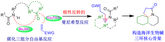 氮a位碳—碳键的形成是合成诸多含氮化合物的关键步骤。该课题组前期发现N-a位氯代酰胺可在一氯二茂钛催化下产生酰胺N-a位碳自由基(Angew. Chem. Int. Ed. 2013, 52, 3494-3498)。在此基础上,设计先将仲酰胺与脂肪醛在三甲基氯硅烷作用下生成氯代酰胺,进而在一氯二茂钛催化下与亲电烯烃发生自由基偶联,“一瓶”反应制备了一系列N-取代-g-氨基酸(酮)衍生物。该反应可一次性串联形成一个碳—氮键和一个碳—碳键,相当于极性反转的曼尼希(Mannich)型反应。值得一提的是,当底物拓展为酮基酰胺时,可高效地合成氮a位具有季碳中心的哌啶酰胺类化合物,为许多含有该结构特征的生物碱的合成提供了一种有效的方法。进一步应用该方法成功地以五步反应39%的总产率实现了一系列海洋生物碱三环核心骨架的构造。