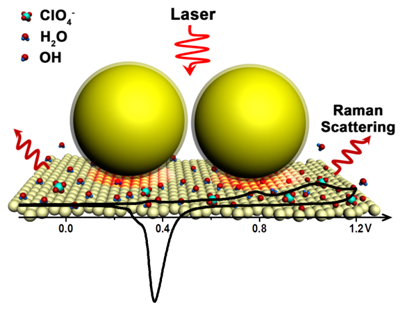 贵金属表面氧化过程的中间物,OH-吸附物种,在表面氧化物膜形成过程、氧还原过程、有机小分子电氧化/还原等电催化过程中起着非常重要的作用。但是至今对该中间物种的研究局限于传统电化学技术以及理论计算基础上的猜测,仍然无法获得金属单晶表面与中间物种成键过程的直接证据。目前以表面增强拉曼光谱(SERS)技术对金表面的氧化过程研究中,受限于信号增强模式,只能在粗糙化的表面获得足够的拉曼信号,无法应用于原子级平滑的单晶表面。在本篇工作中的电化学SHINERS技术,突破了长期以来在表面形貌、基底材料方面限制,在原子级平滑的金单晶表面,原位监测了表面电氧化过程中,反应中间物种AuOH/AuO的电化学过程。于此同时,本篇工作系统地研究了晶面取向、pH值以及阴离子效应对该过程以及中间物种的影响。实验结果与理论计算值得到了较好的匹配结合,验证了在电化学界中长期以来只能基于传统方法以及理论计算上的猜测。本篇工作展示了一种在原子级平滑单晶表面进行原位检测反应过程的独特方法,为催化剂设计乃至能源材料创新提供了可靠的研究技术。