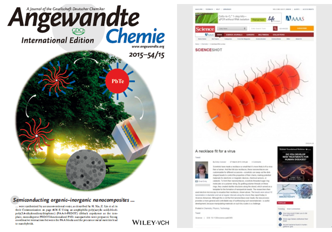 2013年,林志群教授提出一种新颖的模板组装法,该星型聚合物模板具有很好的普适性,他们组装了各种不同化学成分的球形、中空、核壳结构的纳米颗粒,但这些纳米结构都是零维纳米材料。文章从聚合物模板开始改进,首先将生长内核即α-环糊精(α-CD)用长链高分子聚乙二醇(PEG)组装串接起来,通过ATRP合成了蠕虫状两亲性的两嵌段共聚物(PAA-b-PS),即将原来的零维模板用长链高分子串起来,合成了一维的聚合物模板,再用该模板制备新颖的一维“纳米项链”结构。这种“纳米项链”尺寸均一,形状规整,由于这些无机纳米颗粒上还覆盖着许多聚苯乙烯(PS)高分子链,所以这些“纳米项链”也被形象地称之为有机−无机杂化羊肉串。最后,通过高分子自洽场理论,模拟计算了“纳米项链”的形成机理。该工作发表于Science Advances(Science 子刊)杂志且Science正刊发表了题为“Crafting organicinorganicshish-kebabs”(Vol. 347, 2005,Iss.6229, 1432)的要闻导读。另外,Science 新闻专栏发表了题为“A necklace fit for a virus”的专题评论。