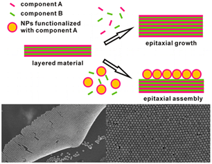 受到传统晶体外延生长模式的启发,将纳米粒子类比于“人造原子”,田中群课题组提出发展了一种称为“外延组装”的新方法:在纳米粒子表面修饰上层状材料的组分之一,即可在层状材料的表面直接组装大面积有序的二维纳米粒子阵列。该方法具有省时、普适性好等优点,对不同组分、不同形状、不同大小的纳米粒子都适用,而且避免了纳米粒子组装体在转移过程中引起的缺陷。他们通过合作,用多种谱学方法证明组装机理类似于晶体的外延生长模式,即粒子间的作用力小于粒子与基底的作用力,并且粒子表面的修饰分子作为层状材料的组分之一,保证了极好的晶格匹配和完美界面。此外,本工作中使用的层状材料的水溶性为纳米粒子的组装提供了动态可逆的可能,使得组装结构变得十分有序。