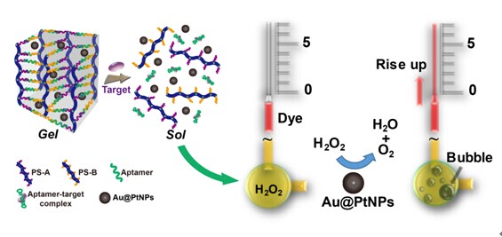 本工作在课题组前期发展的智能DNA水凝胶传感技术的基础上(Angew. Chem. Int. Ed., 2010, 49, 1052-1056; J. Am. Chem. Soc., 2013, 135, 3748-3751),提出了基于距离变化定量即时检测的新原理。距离变化是一种非常理想的可视化定量检测方法。在日常生活存在着大量基于距离变化的测量物理参数的装置,比如温度计、血压计、弹簧秤等。该工作模拟温度计原理,利用铂金纳米粒子催化双氧水分解产生氧气的反应,设计指示气体体积变化的微流控芯片,实现了利用距离变化定量可视化检测化学或生物分子的目的。将铂金纳米粒子包裹于智能响应DNA水凝胶中,靶标响应导致凝胶瓦解释放铂金纳米粒子,在微流控芯片内催化双氧水分解产生气体,从而导致微小体积内压力变化,推动指示剂液流沿微通道运动,实现可视化距离读取的定量检测。该工作实现了用类似于温度计的简单装置,可视化快速定量检测毒品、毒素、重金属、生物分子等靶标,为医疗诊断、环境检测、食品安全监控等相关领域的即时检测提供了新思路。