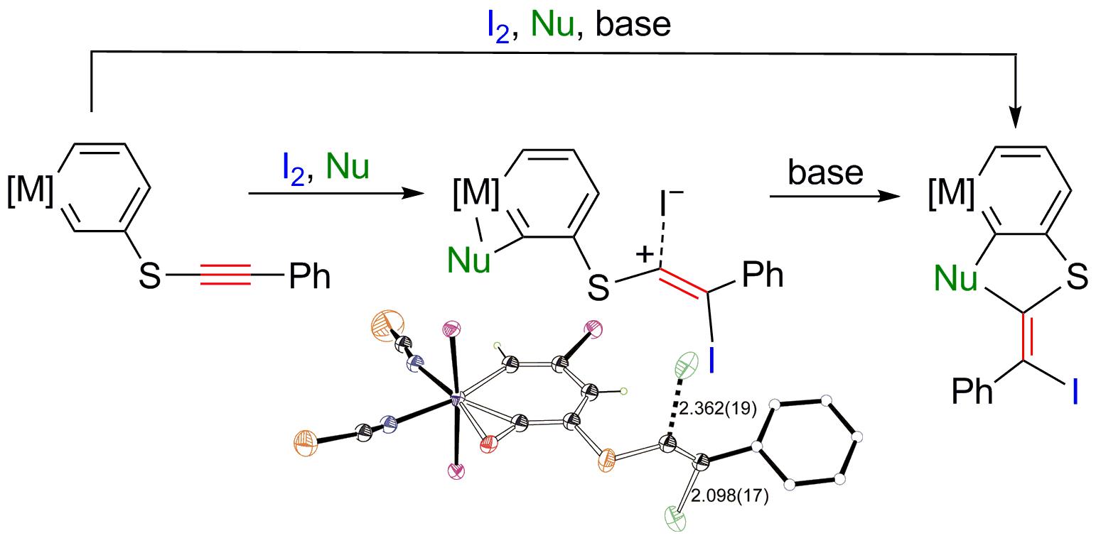 通过炔烃亲电环化反应构筑杂环化合物是有机合成中非常重要的反应。由于该方法兼具操作简便、体系温和、机理简单和环境友好等特点,逐渐发展成为目前被广为倡导的绿色合成化学的新方法之一。夏海平教授课题组在近年的研究中,最先将此反应拓展到金属杂芳香体系。采用芳环上预设炔基的金属苯与碘单质反应,在外加亲核试剂(水或胺类试剂)的作用下高效地实现分子间亲电环化反应,合成了一系列结构新颖的金属杂稠环芳烃。并且,研究中还首次成功地捕获了炔烃亲电环化反应的关键中间体。有趣的是,单晶衍射表征数据和理论计算结果均表明该中间体并非此前被列入教科书的环状碘鎓结构,而应描述为紧密型离子对结构。该研究不仅首次在实验上捕获了炔烃亲电环化反应的中间体,进一步明晰了反应机理,还为金属杂多环芳香化合物的构筑提供了新的思路。
