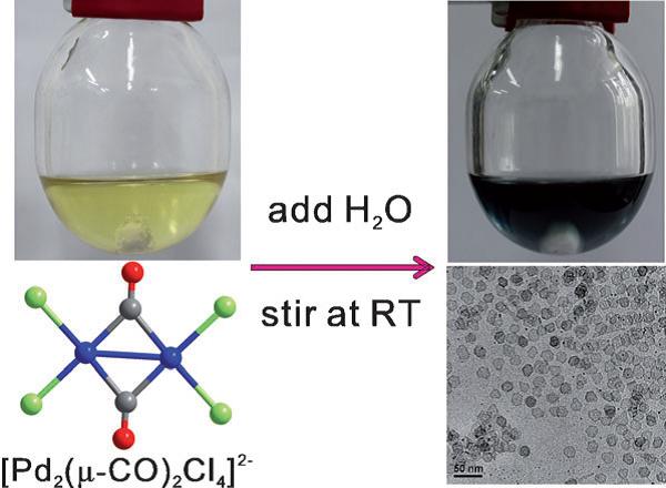 特定形貌贵金属纳米晶体在催化、光谱学、生物标记、肿瘤治疗等领域具有重要的应用价值,它们的控制合成在近年一直备受关注。多数贵金属纳米晶体的形貌调控需要有机保护剂的帮助,但有机保护剂的引入使贵金属纳米晶的形貌调控存在两大重要难点:1)纳米晶的表面难于清洁;2)难于深入认识纳米晶的形貌调控机理。针对这些难题,该研究成功地发展了一种无需引入有机保护剂、可在室温下制备表面清洁超薄Pd纳米片的简单方法,只需将CO与氯钯酸的DMF溶液反应所得的黄色中间体溶液和适量的水混合即可得到尺寸均一、厚度为1.8nm的蓝色超薄钯纳米片。X-射线单晶衍射和X-射线吸收光谱均证实了黄色的重要中间体为[Pd2(μ-CO)2Cl4]2-,是一种Pd(I)的双核羰基金属配合物,两个Pd原子间有强的Pd-Pd金属键和两个桥连CO。13C NMR实验发现了 [Pd2(μ-13CO)2Cl4]2-与水混合后,部分桥连的13CO被氧化为13CO2,[Pd2(μ-CO)2Cl4]2-中的桥连CO扮演着还原剂和形貌控制剂的双重角色。课题组的前期研究已发现超薄Pd纳米片具独特的催化和肿瘤近红外光热疗性能,该项研究不仅简化了这些功能性超薄Pd纳米片的合成方法,而且进一步证实了强配位分子在调控贵金属纳米晶表面结构中的重要性。更重要的是,所制备得到Pd纳米片的表面清洁,为研究有机保护剂对Pd纳米晶催化性能的影响提供了很好的平台,相较表面含聚乙烯吡咯烷酮的Pd纳米片,表面清洁的Pd纳米片在甲酸的电催化氧化和苯乙烯加氢反应中均表现出更为优越的性能。