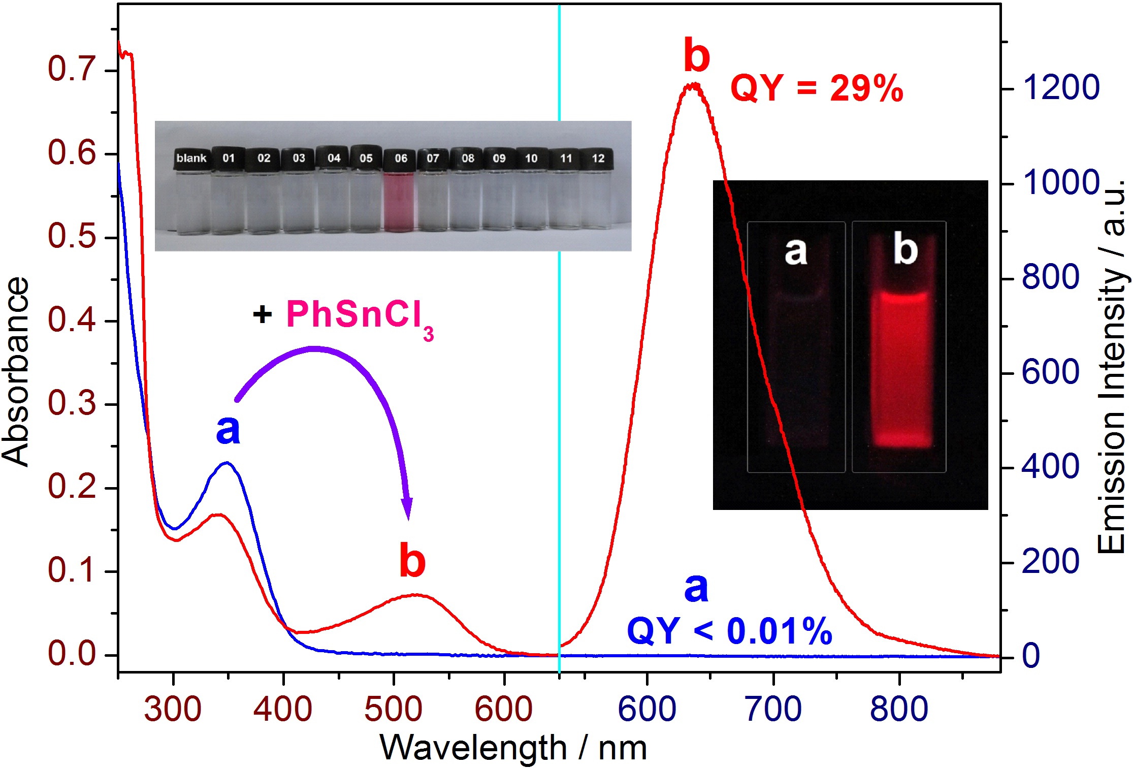 卤键在超分子自组装过程中的广泛性和重要性可与氢键相媲美,但在分子传感领域尚未得到实质性的应用。该合作团队以多异氰基金属配位中心为识别单元,发展了一类具有特殊聚集诱导发光效应的金属有机荧光受体分子。在卤化有机锡存在下,受体分子受诱聚集并发射强的红色荧光,其发光量子产率可增强数千倍。多卤化物(如二噁英、多氯联苯和有机氯农药等)的环境危害性一直广受关注,但其分子传感迄今仍未取得突破,因为采用传统的非共价作用力(如配位作用、氢键作用和静电作用等)难以实现这类化合物的分子识别。本研究工作从分子识别机制和信号响应模式两个核心方面为多卤化物的光学分子传感提供了有效的模型。