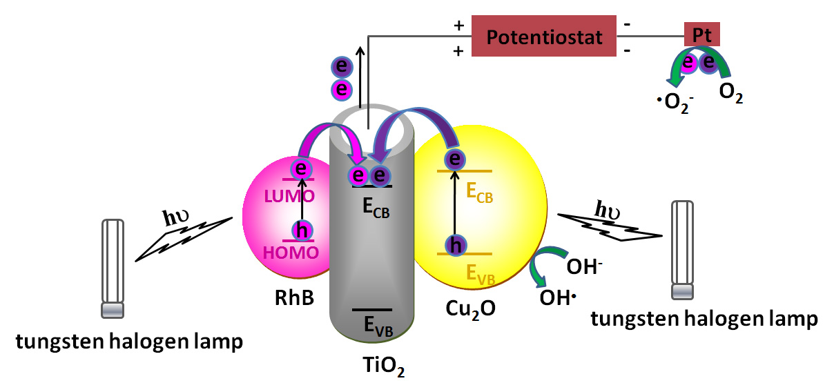TiO2因具有强氧化、抗腐蚀、无毒等特点而受到人们广泛兴趣。然而,3.2 eV的禁带宽度使其只能吸收紫外光,对太阳能的利用率低。高度有序的TiO2纳米管阵列可发挥结构稳定、光生电荷快捷、协同作用强等优势,该课题组利用超声液相沉积法,在TiO2纳米管阵列上沉积禁带宽度为2.17 eV的Cu2O纳米颗粒形成p-n异质结光电极,系统地研究了其光电化学性能及光电催化降解有机污染物机理(见上图)。结果表明,TiO2纳米管阵列光电极负载少量Cu2O纳米颗粒后,在可见光照射下的光电化学活性和对目标污染物罗丹明B的光电催化降解速率显著提高。他们还首次提出一种选择光电催化偏压的方法,以最大程度地利用太阳光和电化学的协同作用降解有机污染物。