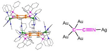 利用含吡啶基膦配体的Au(I)−Ag(I) 异金属簇合物实现了在温和条件下对乙腈的C(sp3)-H的活化。单晶结构分析揭示全脱氢的乙腈一端的碳桥连在四个金离子上,另一端的氮连接在一个银离子上,形成新颖的μ5-CCN3− 配位模式。研究表明Au(I)−Ag(I)簇合物中的O2-在C-H活化的过程中起到了重要的作用,有助于对相关金催化C-H活化过程的理解。