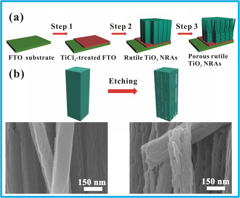 一维阵列结构的单晶金红石TiO2纳米棒具有诸多独特的光电性质,已被广泛地应用于光催化、光解水制氢、超轻超疏自清洁图层、传感器和染料敏化太阳能等能源环境研究。虽然目前已有许多研究致力于提高单晶金红石TiO2纳米棒阵列膜的比表面积,但如何发展一种有效、环保、综合性能优良的制备方法仍然是一大挑战。在已有的研究基础上,林昌健教授课题组首次报道了通过简单的水热法结合后续的化学刻蚀,在透明导电玻璃基底表面构筑结合力强、膜厚达~20μm的高比表面积、多孔状单晶金红石TiO2纳米棒阵列膜,并在染料敏化太阳能电池应用中取得了7.91%的光电转化效率。这是目前国内外基于金红石TiO2纳米棒阵列膜的染料敏化太阳能电池中报道的最高效率。该研究是在林昌健教授指导下,由课题组硕士研究生吕妙强(第一作者)及其他研究生共同参与完成。该研究工作得到国家自然科学基金委(项目批准号:51072170、21021002)、科技部(项目批准号:2012CB932900)及福建省科技厅等资助。