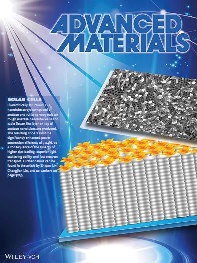 我院林昌健教授课题组最近成功构筑了一种制备复杂分级结构的TiO2纳米管阵列光阳极,并大幅度提高了此类光阳极材料染料敏化太阳能电池的光电转化效率。相关结果发表在工程技术类国际顶级期刊Adv. Mater. (2013, 25, 3039-3044),并被选为卷首插画论文(“Frontispiece” paper)(下图)。
