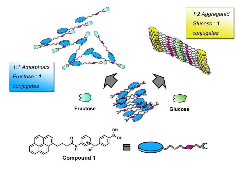 目前基于硼酸的荧光葡萄糖传感器可以达到很高的灵敏度,但它们同时可以与果糖结合,因而缺乏选择性。为了克服这一难题,江云宝教授实验室联合英国巴斯大学Tony D. James教授和伯明翰大学John S. Fossey博士,设计了含有芘荧光团的两亲型硼酸探针分子。该探针分子于水溶液中的聚集行为因加入的糖分子物种的变化,表现出对葡萄糖和果糖截然不同的响应。这是迄今最为简便且高效的葡萄糖传感体系。