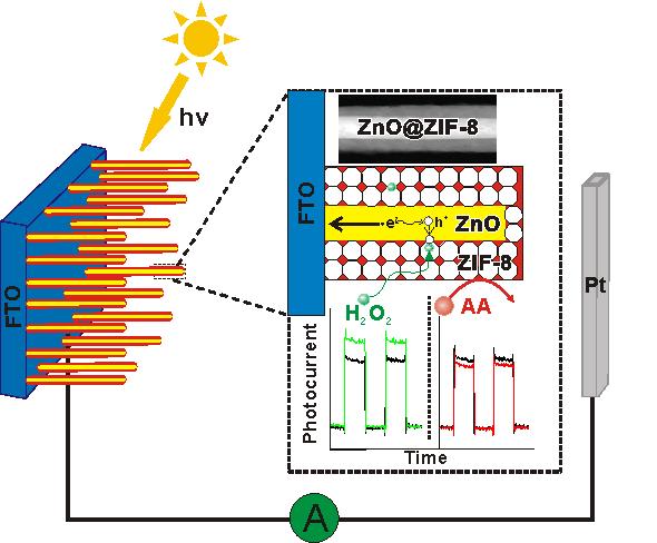 众所周知,作为金属氧化物半导体的代表材料之一,ZnO在传感、光电、压电等方面都展现出极为优异的性能;而MOFs作为多孔晶态材料具有规则孔道以及高的孔隙率,在气体存储和分离以及催化等方面都有很好的潜在应用。该团队以ZnO纳米棒为模板,通过控制Zn2+的缓释及其与2-甲基咪唑的配位作用,形成核壳结构的ZnO@ZIF-8的纳米复合材料。该方法避免了传统合成方法中MOFs在模板之外成核的弊端。更有意义的是,他们首次将ZnO的光电响应和MOFs规则孔道对分子尺寸的选择性结合,并成功地应用于光电响应传感器,该器件对不同尺寸的空穴捕获剂分子呈现截然不同的响应效果(见上图)。上述研究表明,将MOFs这一新型晶态多孔材料与半导体等传统无机功能材料相结合,不仅可以拓展MOFs的应用范围,而且可以使得传统功能材料产生新的功能。