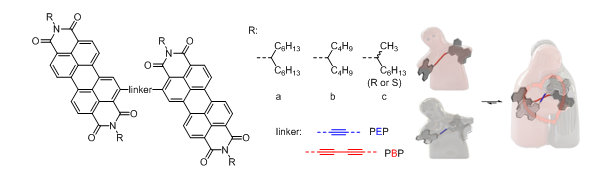 精确构建芳香体系的离散π组装体是深入研究有机π功能分子之间相互作用以及实现分子性质与材料性质之间有效调控的关键。然而,芳香体系π-π堆积作用的双向性使得构建结构均一的离散π组装体极具挑战性。另一方面,在传统的主-客体化学中,虽然主体分子和客体分子可通过尺寸匹配效应形成确定比例的离散组装体,但是主体和客体分子之间较大的结构差异使得它们之间缺少电子耦合作用,无法被应用于有机光电器件的研究中。取长补短,相得益彰。研究团队基于前期在铑催化PDI邻位C-H键直接官能团化反应研究中积累的经验(Org. Lett., 2016, 18, 5908-5911; 2017, 19, 5438-5441; 2018, 20, 6117-6120),设计和合成了两类PDI二倍体类似物:PEP和PBP。他们利用多种表征技术证明在低极性溶液中,在很宽的浓度范围内(1 mM – 40 mM),这两类PDI二倍体类似物等比例混合时都能够以主-客体组装的方式形成十字交叉形的二聚体PEP-PBP。同时由于PEP和PBP分子结构类似且PDI单元之间的强耦合作用被有效保持,PEP-PBP二聚体表现出特殊的物理性质,其在构建长波长、长寿命及高量子产率的激基缔合物荧光,以及在手性识别等方面具有独特的优势。该工作为离散型π堆积体的构建及应用提供了一条新思路。