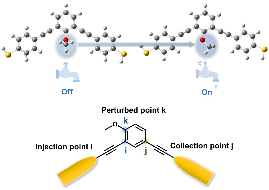 该工作系统研究了甲氧基基团连接位置和构象变化对寡聚苯乙炔分子体系电荷输运过程中量子干涉效应的影响。通过改变中心苯环甲氧基的取代位置和调控其构象转化,可以有效调控分子结中电荷输运过程的量子干涉现象,实现接近一个数量级的单分子电导调控。密度泛函理论计算结果表明,通过调控中心苯环上甲氧基的构型,可以改变电子在分子导线内电荷输运的干涉过程,使具有相增量子干涉效应的分子器件转变为相消量子干涉效应,并使分子电导改变将近一个数量级。这一研究工作首次提出了 “单分子水龙头”的概念,即通过外加取代基的构象转换效应实现了量子干涉的调控,为未来基于量子干涉效应的新型分子器件的设计和制备提供了一种全新的思路。