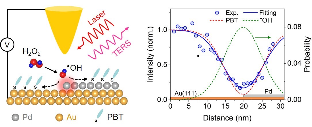 课题组利用针尖增强拉曼光谱(tip-enhanced Raman spectroscopy, TERS)从纳米尺度研究在过氧化氢(H2O2)存在下,硫醇氧化反应过程中羟基自由基这一氧活性物种在钯/金(Pd/Au)双金属表界面的形成与分布。高活性的羟基自由基可以由金属催化剂诱导生成,从而介导金属表面上作为探针的硫醇分子的氧化,使其从表面脱附。通过对未反应的硫醇分子的TERS成像,发现Pd位点是产生羟基自由基的活性位点,并且Pd边缘位具有更强的催化活性。同时观察到羟基自由基由边缘位Pd位点产生并向四周的扩散行为,其扩散长度约为5.4 nm,对应的寿命在纳秒(10-9 s)尺度。该工作首次利用TERS在纳米尺度下观察到了双金属催化剂的表面活性位,为继续对相关体系进行原位表征提供了重要的表征工具。利用具有较大拉曼散射截面的分子作为探针可以非常有效的表征小分子的动态行为,这为未来TERS研究小分子体系提供了新的方法。