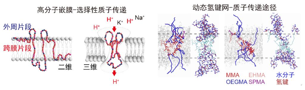 发展有生物活性的人工材料一直是许多领域的研究焦点。跨膜离子通道由于在细胞信号转导、物质传递、能量转换等生命过程中发挥关键作用,是人工材料设计的一个重要目标。结构已知的天然离子通道蛋白在分子层面展示出极为精巧的序列与结构控制,这也使设计者长期希望通过搭建复杂膜内立体结构来寻求高效的离子通道功能。近些年,可控膜内通道结构的研究已取得很大的进展,然而设计具有接近天然通道复杂度,以及同时在传输选择性和速率上达到天然通道水平的人工材料仍有极大的挑战性。该工作提出了另一个研究思路,绕开复杂结构设计的难题,以离子跨膜传递的机理为设计基础,以跨膜质子通道为目标,设计了可自发嵌入磷脂双分子层的随机序列两亲高分子,在膜内形成了动态氢键网络作为质子跳跃传递途径。该高分子质子通道在传递速率和选择性方面皆达到接近A型流感M2质子通道的水平。这项工作也介绍了如何通过四种单体的RAFT聚合,调控具有随机序列和动态结构的高分子的整体化学性质,为关联高分子序列与功能方面的研究提供了一个有效的方法。