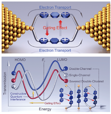 基于上述工作发展的分子链间电输运表征技术,洪文晶教授课题组与诺贝尔奖得主、美国西北大学Fraser Stoddart教授合作,在研究带电大环分子体系的量子干涉效应中发现,双通道带电大环分子体系的两条分子链间能够发生强静电相互作用,而这一强静电相互作用可以有效调控由通过两条分子链内电输运的相长量子干涉效应,从而实现相对单条分子链电输运超过50倍的电导增强。这一研究成果验证了分子链间非化学键的强静电相互作用能显著调控相消量子干涉效应,提出了分子链间强静电相互作用的单分子器件“自门控(self-gating)”设计新思路。