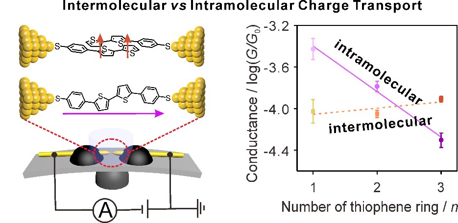 该工作采用机械可控裂结技术通过分别构建模拟分子链内输运的单分子器件和模拟分子链间输运的双分子组装体器件。研究发现,噻吩单分子器件通过分子链内的电输运过程中电导随分子长度增加呈指数降低,而噻吩组装体器件分子间通过分子链间电输运过程电导基本不随分子共轭结构及长度的变化而改变。表明在单分子尺度,分子链间输运甚至可以提供比分子链内输运更高效的电传输途径。通过分析不同共轭长度噻吩分子形成双分子组装体器件的概率,发现其随着分子共轭长度的增加而提高,证明噻吩分子共轭区域的增大提升了分子链间组装概率。该工作通过在单分子尺度构筑模型分子体系,揭示了噻吩类衍生物分子结构与其电输运性质之间的构效关系,为理解聚集态有机半导体材料的电输运过程提供了独特的视角,也为构筑基于分子链间电输运作用的新型分子器件开拓了思路。