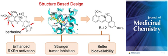 张延东教授课题组与医学院胡天惠教授课题组合作在国际药物化学顶级期刊《Journal of Medicinal Chemistry》发表研究论文:“Structure-activity relationship study enables the discovery of a novel berberine analogue as RXRα activator to inhibit colon cancer”(DOI:10.1021/acs.jmedchem.0c00088),针对黄连素与视黄醇X受体(RXRa)的结合模式展开构效关系研究,发现了比黄连素活性更好、生物利用度更高的靶向药物先导物。